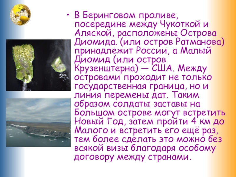 (или остров Ратманова) принадлежит России, а Малый Диомид (или остров Крузенштерна) — США. Между островами проходит не только государственная граница, но и линия перемены дат. Таким образом солдаты заставы на Большом острове могут встретить Новый Год, затем пройти 4 км до Малого и встретить его ещё раз, тем более сделать это можно без всякой визы благодаря особому договору между странами.