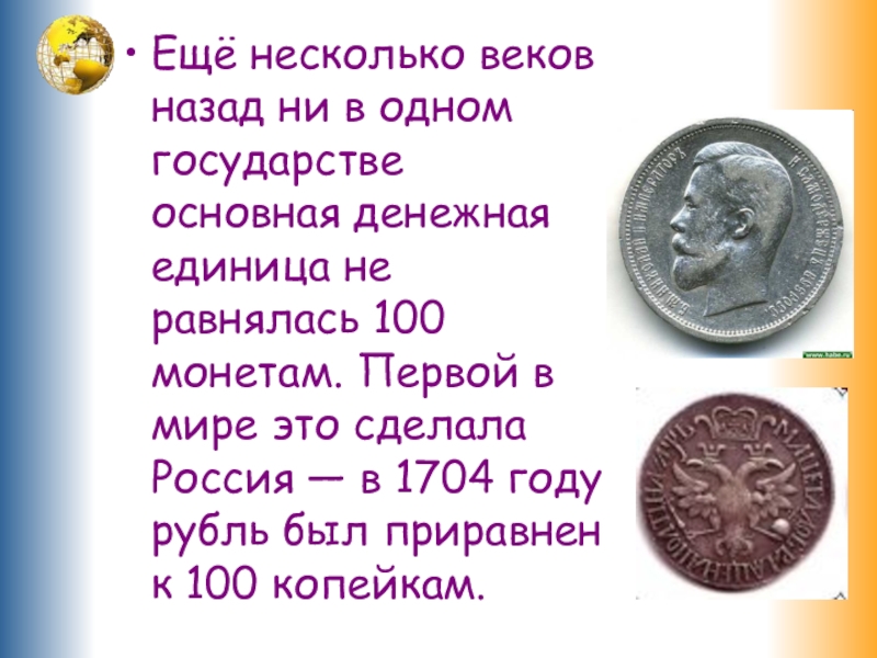 не равнялась 100 монетам. Первой в мире это сделала Россия — в 1704 году рубль был приравнен к 100 копейкам.