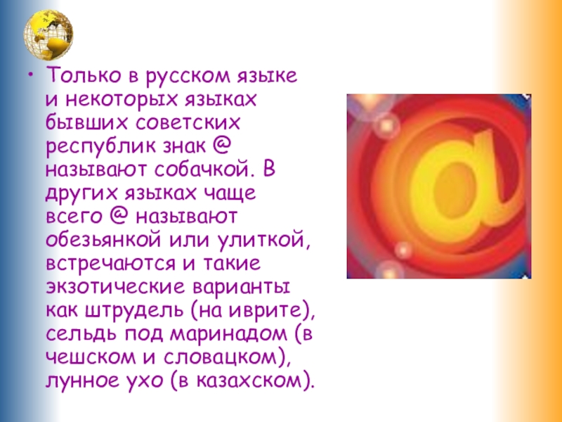 @ называют собачкой. В других языках чаще всего @ называют обезьянкой или улиткой, встречаются и такие экзотические варианты как штрудель (на иврите), сельдь под маринадом (в чешском и словацком), лунное ухо (в казахском).