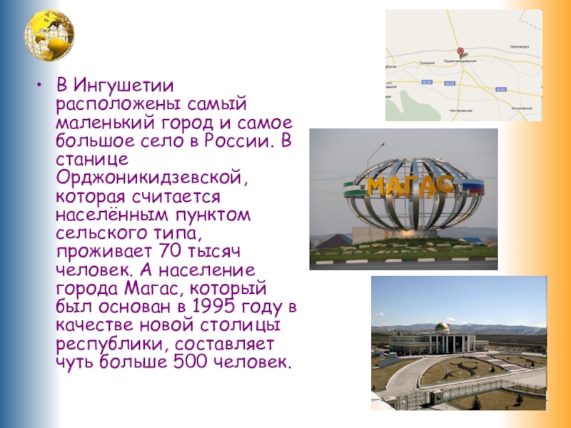 России. В станице Орджоникидзевской, которая считается населённым пунктом сельского типа, проживает 70 тысяч человек. А население города Магас, который был основан в 1995 году в качестве новой столицы республики, составляет чуть больше 500 человек.