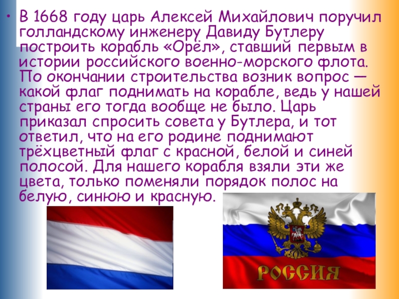 построить корабль «Орёл», ставший первым в истории российского военно-морского флота. По окончании строительства возник вопрос — какой флаг поднимать на корабле, ведь у нашей страны его тогда вообще не было. Царь приказал спросить совета у Бутлера, и тот ответил, что на его родине поднимают трёхцветный флаг с красной, белой и синей полосой. Для нашего корабля взяли эти же цвета, только поменяли порядок полос на белую, синюю и красную.