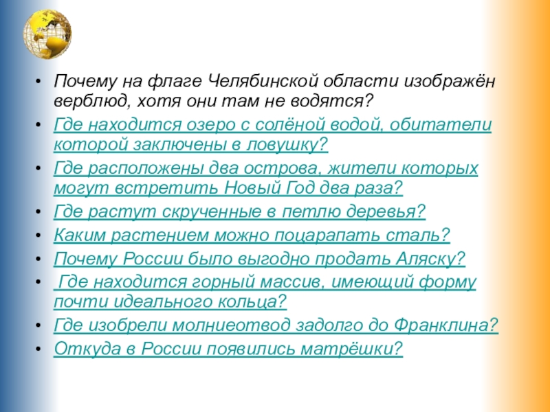Слайд 3Почему на флаге Челябинской области изображён верблюд, хотя они там не