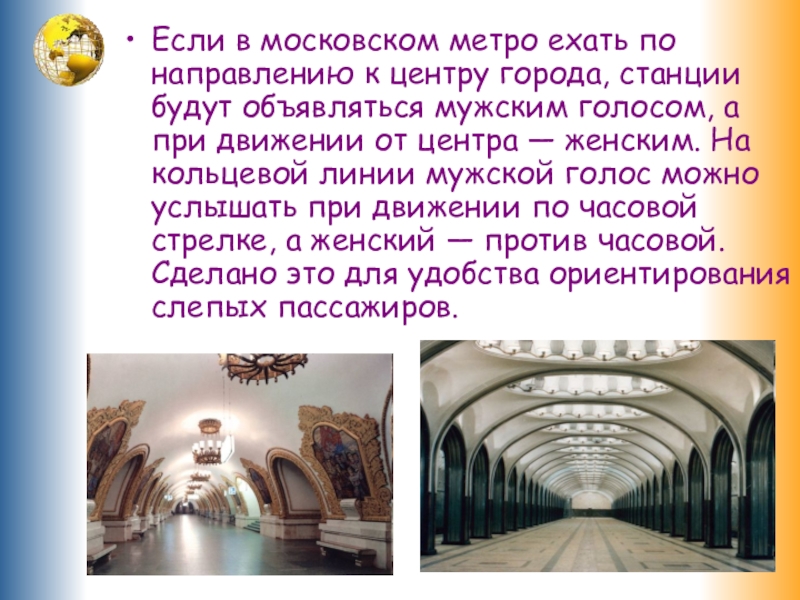 будут объявляться мужским голосом, а при движении от центра — женским. На кольцевой линии мужской голос можно услышать при движении по часовой стрелке, а женский — против часовой. Сделано это для удобства ориентирования слепых пассажиров.
