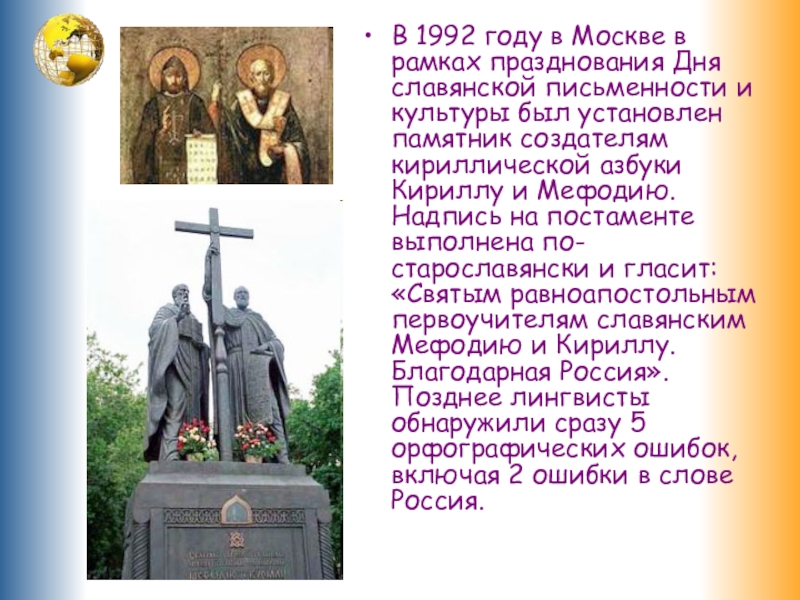 и культуры был установлен памятник создателям кириллической азбуки Кириллу и Мефодию. Надпись на постаменте выполнена по-старославянски и гласит: «Святым равноапостольным первоучителям славянским Мефодию и Кириллу. Благодарная Россия». Позднее лингвисты обнаружили сразу 5 орфографических ошибок, включая 2 ошибки в слове Россия.
