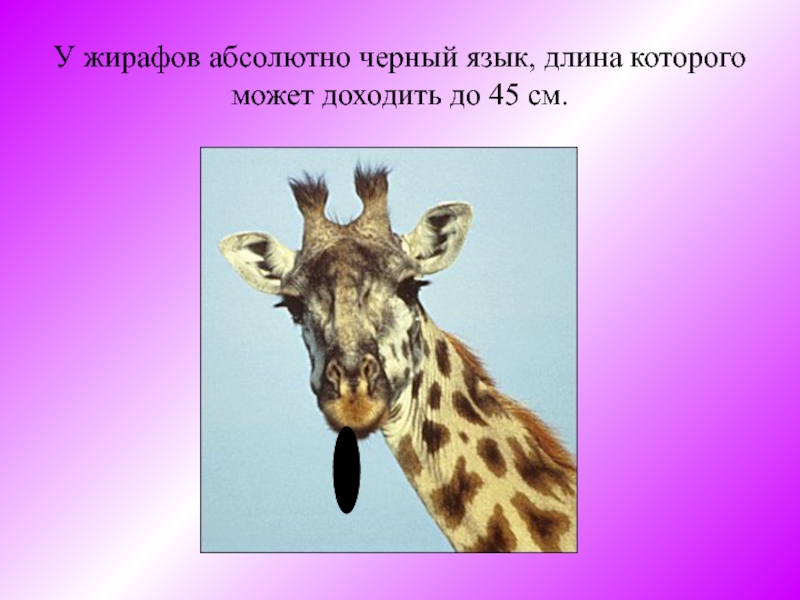 Слайд 2У жирафов абсолютно черный язык, длина которого может доходить до 45