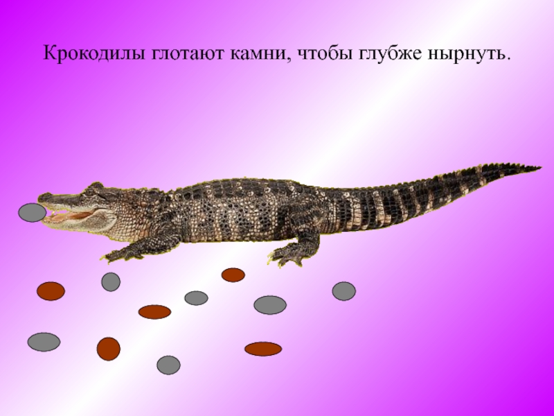 Слайд 17Крокодилы глотают камни, чтобы глубже нырнуть.