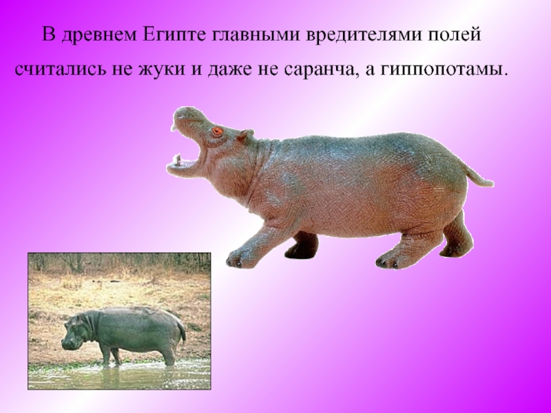 В древнем Египте главными вредителями полей считались не жуки и даже не саранча, а гиппопотамы.