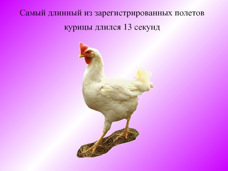 Слайд 9Самый длинный из зарегистрированных полетов курицы длился 13 секунд