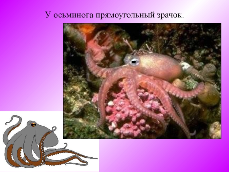 Слайд 4У осьминога прямоугольный зрачок.