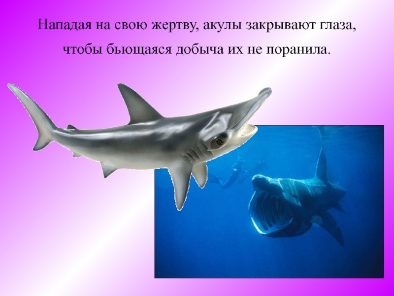 Слайд 11Нападая на свою жертву, акулы закрывают глаза, чтобы бьющаяся добыча их
