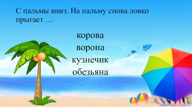 Слайд 4С пальмы вниз. На пальму снова ловко прыгает …