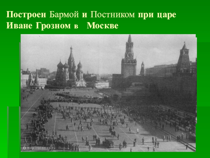 Слайд 6Построен Бармой и Постником при царе Иване Грозном в Москве