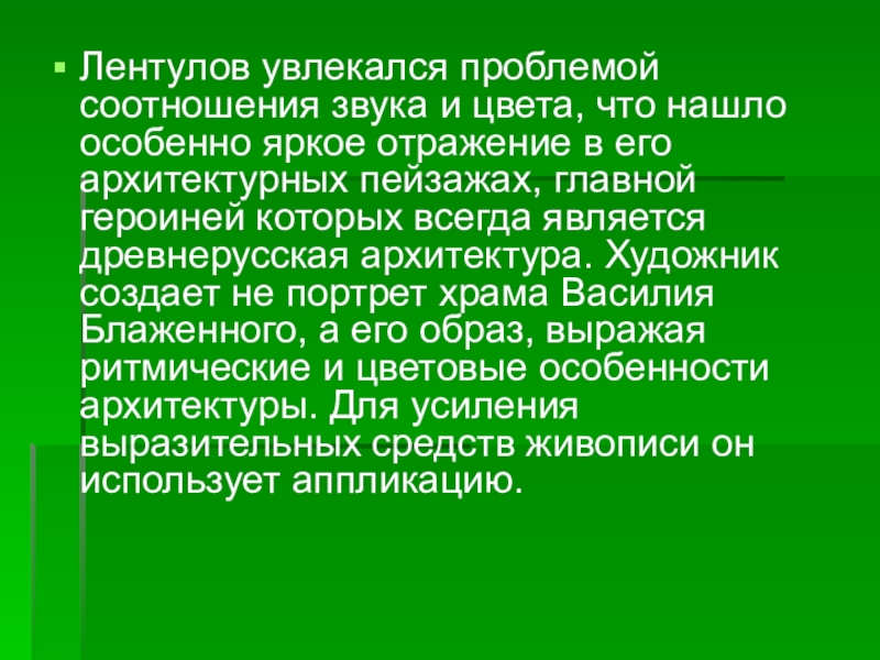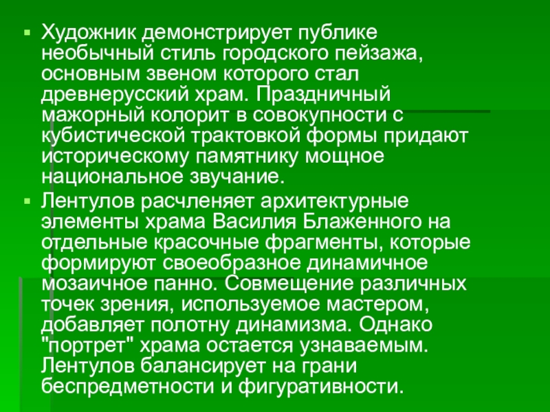 отражение в его архитектурных пейзажах, главной героиней которых всегда является древнерусская архитектура. Художник создает не портрет храма Василия Блаженного, а его образ, выражая ритмические и цветовые особенности архитектуры. Для усиления выразительных средств живописи он использует аппликацию.