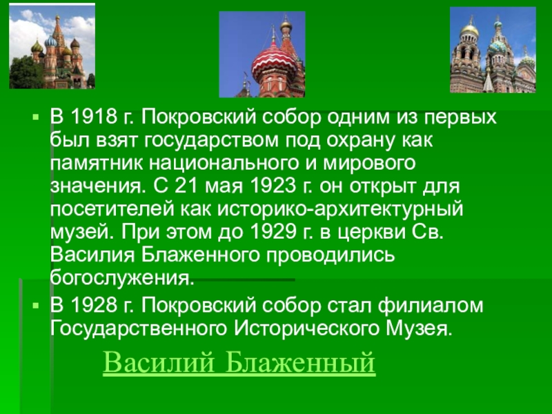 В 1928 г. Покровский собор стал филиалом Государственного Исторического Музея.