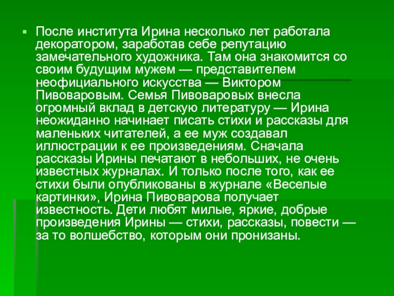 художника. Там она знакомится со своим будущим мужем — представителем неофициального искусства — Виктором Пивоваровым. Семья Пивоваровых внесла огромный вклад в детскую литературу — Ирина неожиданно начинает писать стихи и рассказы для маленьких читателей, а ее муж создавал иллюстрации к ее произведениям. Сначала рассказы Ирины печатают в небольших, не очень известных журналах. И только после того, как ее стихи были опубликованы в журнале «Веселые картинки», Ирина Пивоварова получает известность. Дети любят милые, яркие, добрые произведения Ирины — стихи, рассказы, повести — за то волшебство, которым они пронизаны.