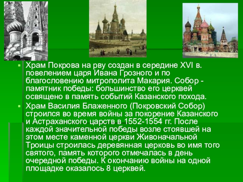 Храм Василия Блаженного (Покровский Собор) строился во время войны за покорение Казанского и Астраханского царств в 1552-1554 гг. После каждой значительной победы возле стоявшей на этом месте каменной церкви Живоначальной Троицы строилась деревянная церковь во имя того святого, память которого отмечалась в день очередной победы. К окончанию войны на одной площадке оказалось 8 церквей.