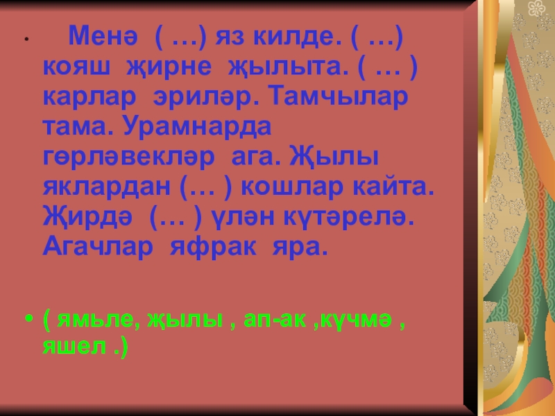 ( ямьле, җылы , ап-ак ,күчмә , яшел .)