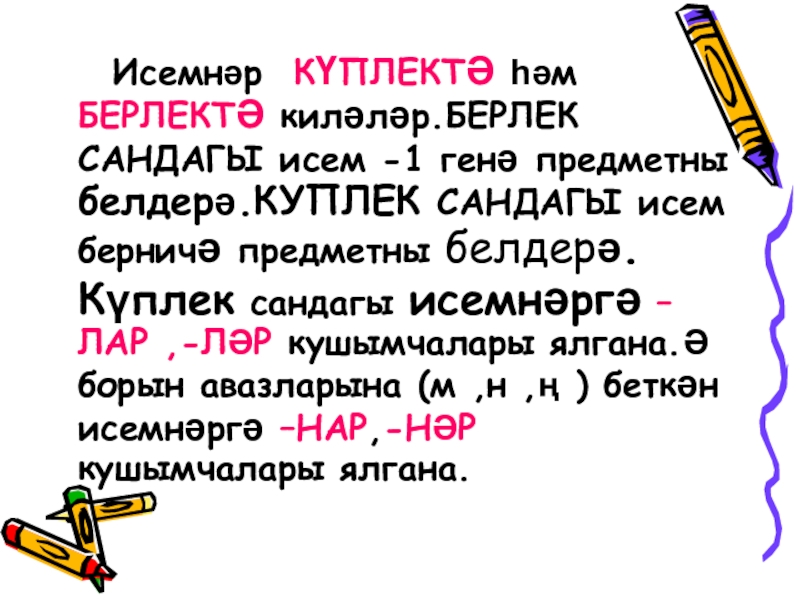 Исемнәр КҮПЛЕКТӘ һәм БЕРЛЕКТӘ киләләр.БЕРЛЕК САНДАГЫ исем