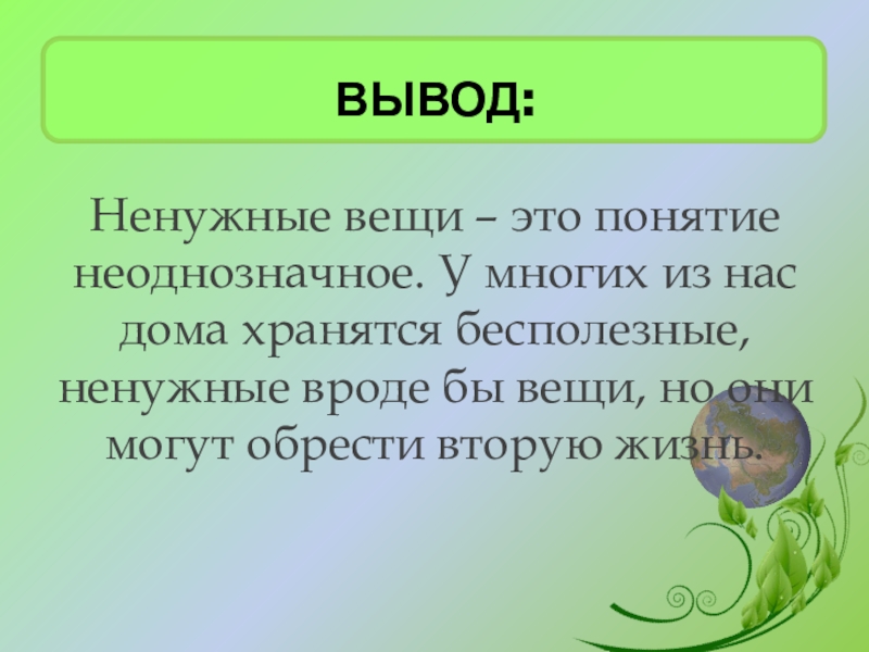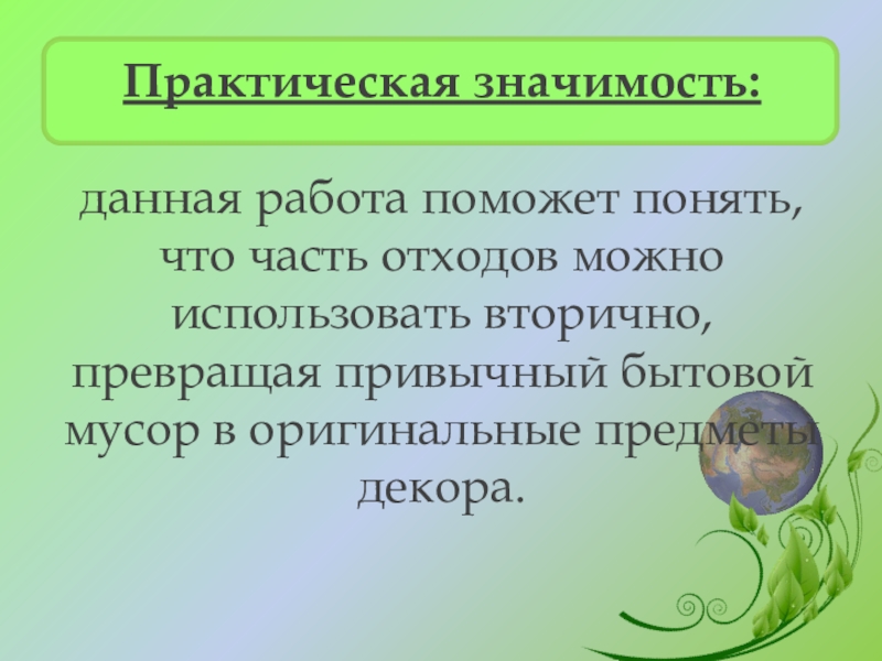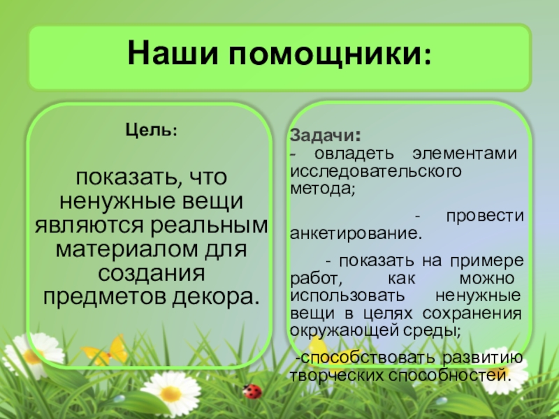 - показать на примере работ, как можно использовать ненужные вещи в целях сохранения окружающей среды;
