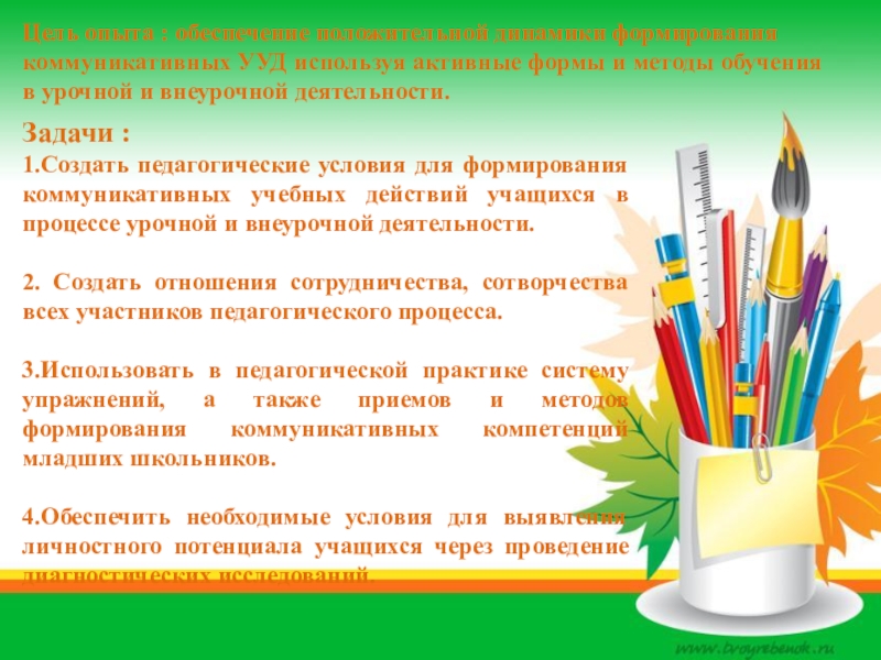 1.Создать педагогические условия для формирования коммуникативных учебных действий учащихся в процессе урочной и внеурочной деятельности.