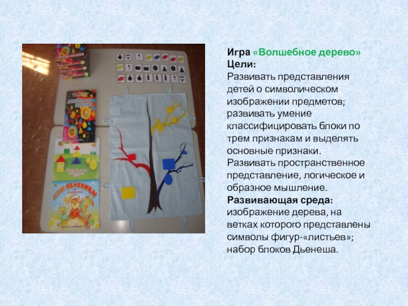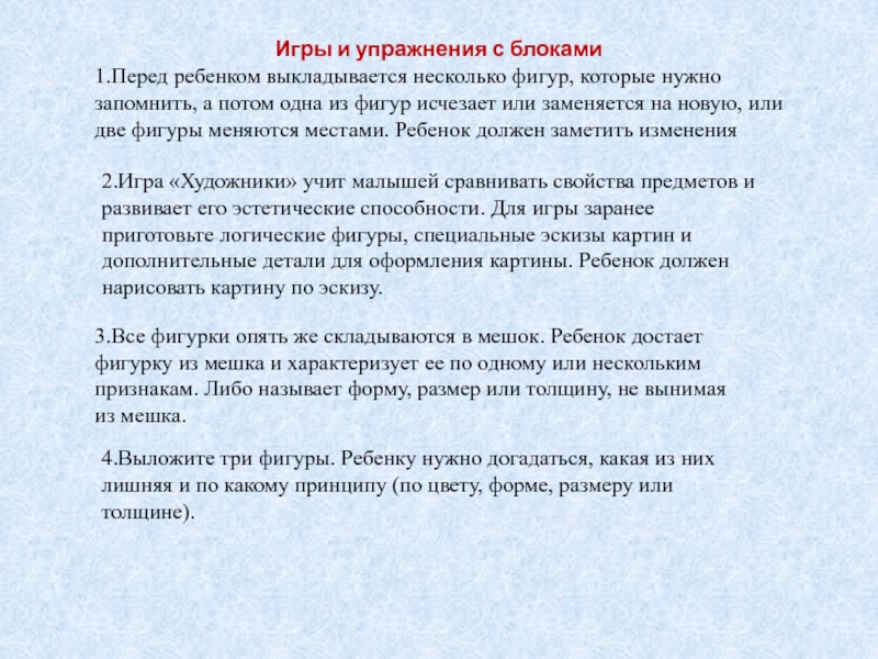 3.Все фигурки опять же складываются в мешок. Ребенок достает фигурку из мешка и характеризует ее по одному или нескольким признакам. Либо называет форму, размер или толщину, не вынимая из мешка.