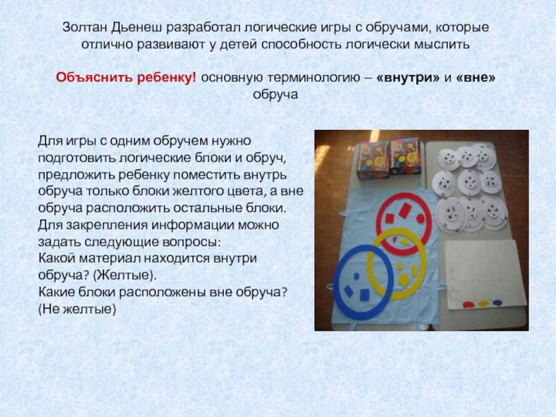 Для игры с одним обручем нужно подготовить логические блоки и обруч, предложить ребенку поместить внутрь обруча только блоки желтого цвета, а вне обруча расположить остальные блоки. Для закрепления информации можно задать следующие вопросы: