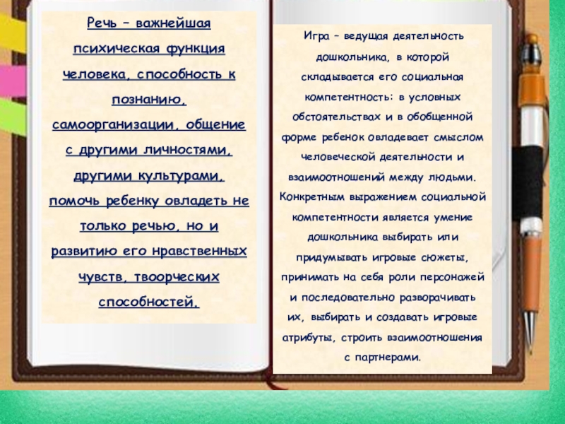 Игра – ведущая деятельность дошкольника, в которой складывается его социальная компетентность: в условных обстоятельствах и в обобщенной форме ребенок овладевает смыслом человеческой деятельности и взаимоотношений между людьми. Конкретным выражением социальной компетентности является умение дошкольника выбирать или придумывать игровые сюжеты, принимать на себя роли персонажей и последовательно разворачивать их, выбирать и создавать игровые атрибуты, строить взаимоотношения с партнерами.