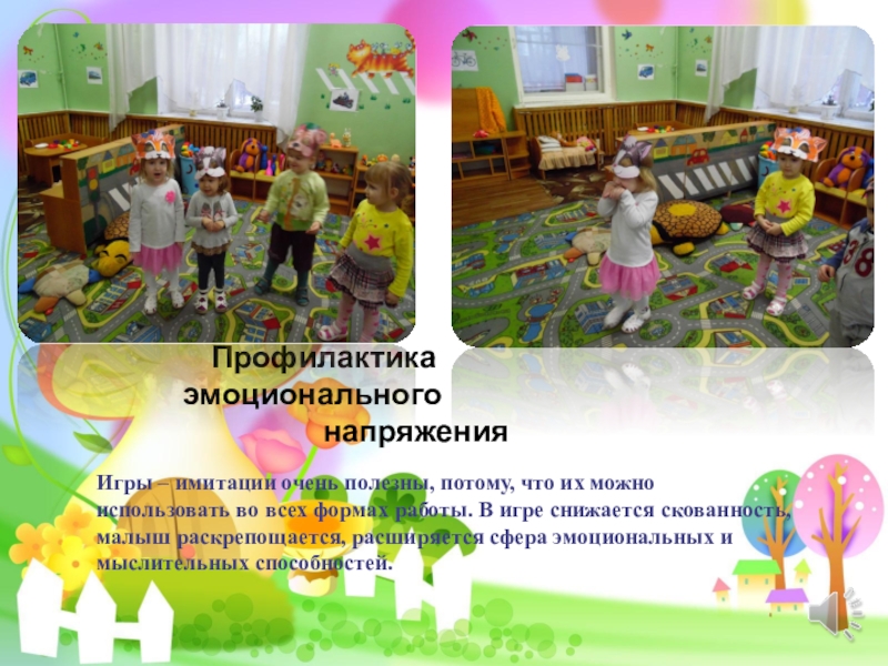 Игры – имитации очень полезны, потому, что их можно использовать во всех формах работы. В игре снижается скованность, малыш раскрепощается, расширяется сфера эмоциональных и мыслительных способностей.