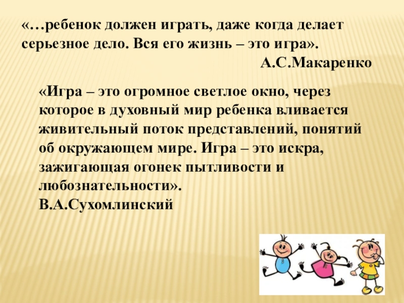 «Игра – это огромное светлое окно, через которое в духовный мир ребенка вливается живительный поток представлений, понятий об окружающем мире. Игра – это искра, зажигающая огонек пытливости и любознательности».