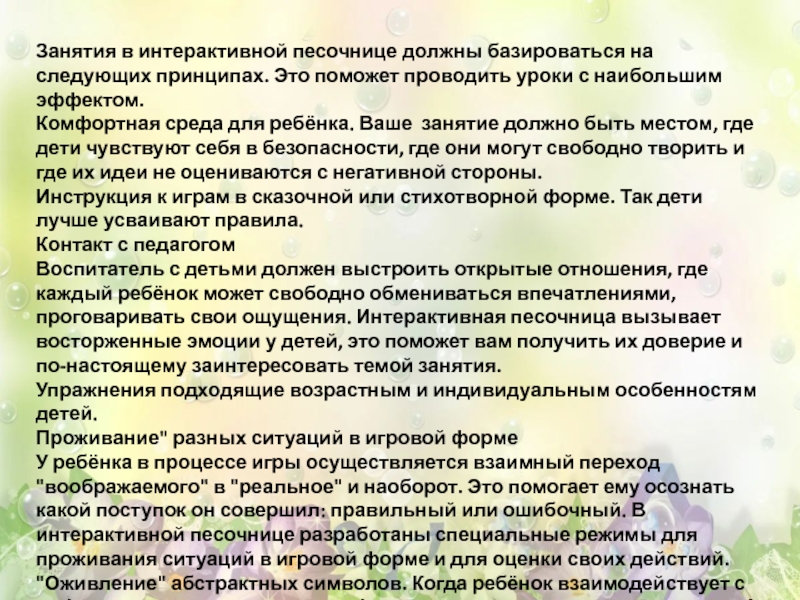 Слайд 12Занятия в интерактивной песочнице должны базироваться на следующих принципах. Это поможет