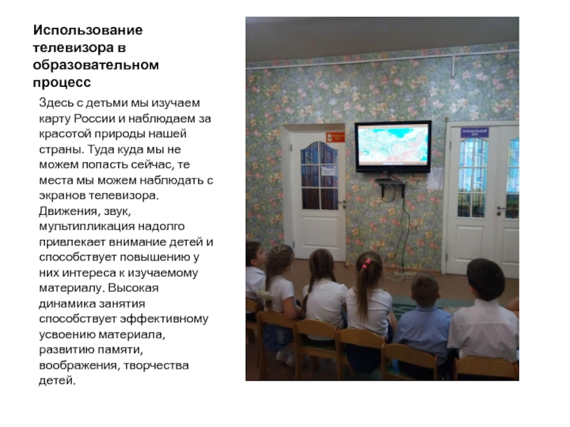 и наблюдаем за красотой природы нашей страны. Туда куда мы не можем попасть сейчас, те места мы можем наблюдать с экранов телевизора. Движения, звук, мультипликация надолго привлекает внимание детей и способствует повышению у них интереса к изучаемому материалу. Высокая динамика занятия способствует эффективному усвоению материала, развитию памяти, воображения, творчества детей.
