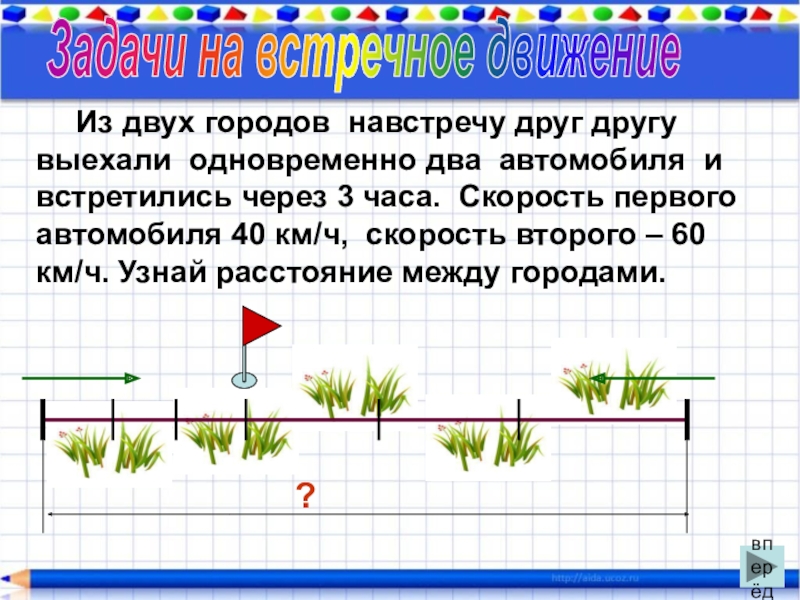 два автомобиля и встретились через 3 часа. Скорость первого автомобиля 40 км/ч, скорость второго – 60 км/ч. Узнай расстояние между городами.