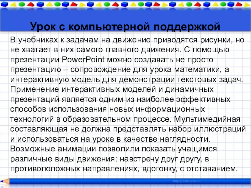 но не хватает в них самого главного движения. С помощью презентации PowerPoint можно создавать не просто презентацию – сопровождение для урока математики, а интерактивную модель для демонстрации текстовых задач. Применение интерактивных моделей и динамичных презентаций является одним из наиболее эффективных способов использования новых информационных технологий в образовательном процессе. Мультимедийная составляющая не должна представлять набор иллюстраций и использоваться на уроке в качестве наглядности. Возможные анимации позволили показать учащимся различные виды движения: навстречу друг другу, в противоположных направлениях, вдогонку, с отставанием.