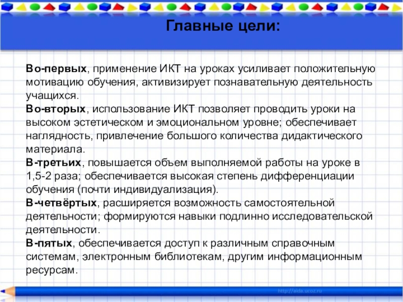 ИКТ должны выступать как вспомогательный элемент учебного процесса, а не основной. Учитывая
