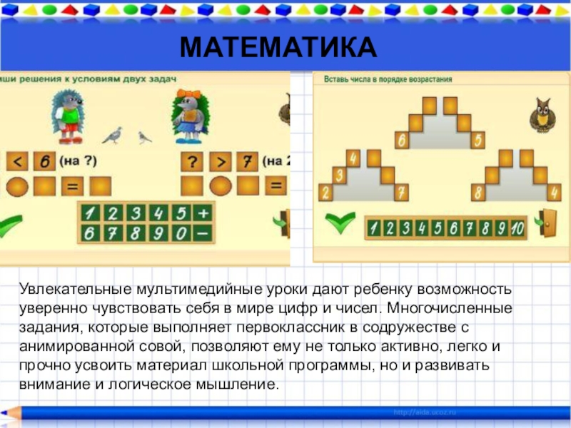цифр и чисел. Многочисленные задания, которые выполняет первоклассник в содружестве с анимированной совой, позволяют ему не только активно, легко и прочно усвоить материал школьной программы, но и развивать внимание и логическое мышление.