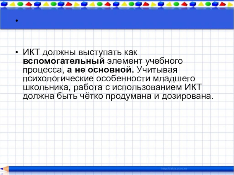 психологические особенности младшего школьника, работа с использованием ИКТ должна быть чётко продумана и дозирована.
