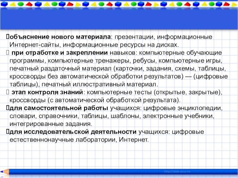 Слайд 5объяснение нового материала: презентации, информационные Интернет-сайты, информационные ресурсы на дисках.