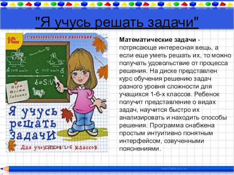 уметь решать их, то можно получать удовольствие от процесса решения. На диске представлен курс обучения решению задач разного уровня сложности для учащихся 1-6-х классов. Ребенок получит представление о видах задач, научится быстро их анализировать и находить способы решения. Программа снабжена простым интуитивно понятным интерфейсом, озвученными пояснениями.