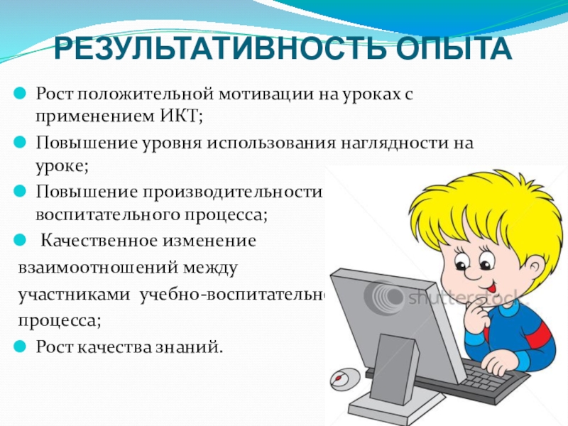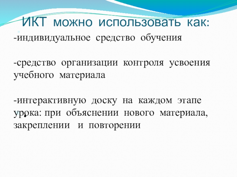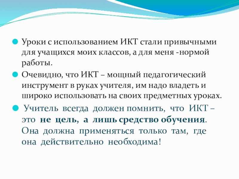 Учитель всегда должен помнить, что ИКТ – это не цель, а лишь средство обучения. Она должна применяться только там, где она действительно необходима!