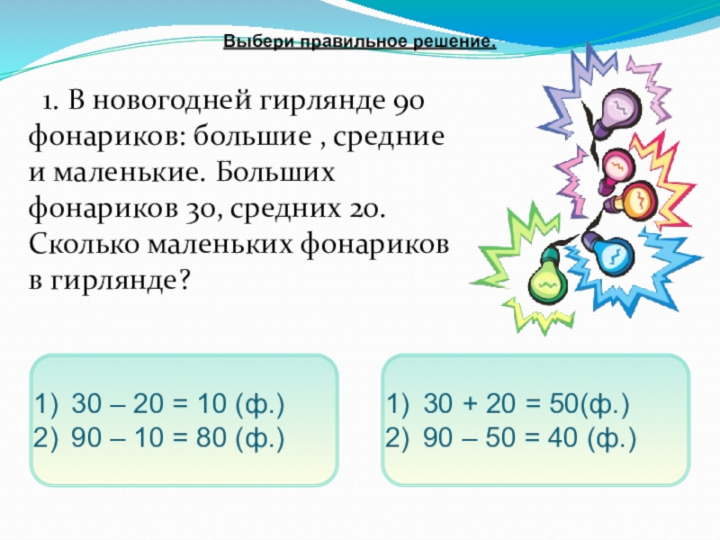 Слайд 11 1. В новогодней гирлянде 90 фонариков: большие , средние и маленькие.