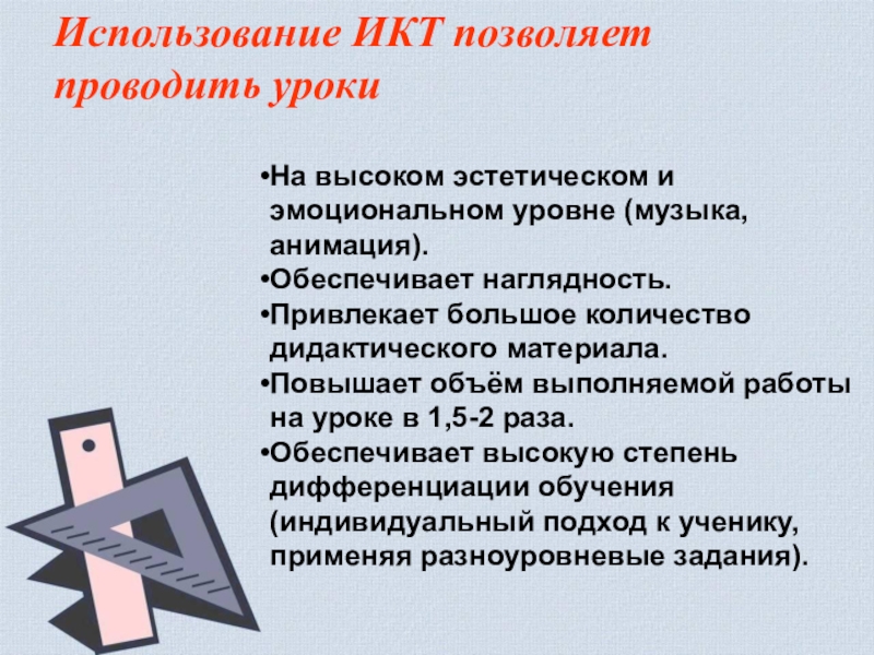Позволяет использовать на уроке современные технические средства, увлекательные для учащихся.