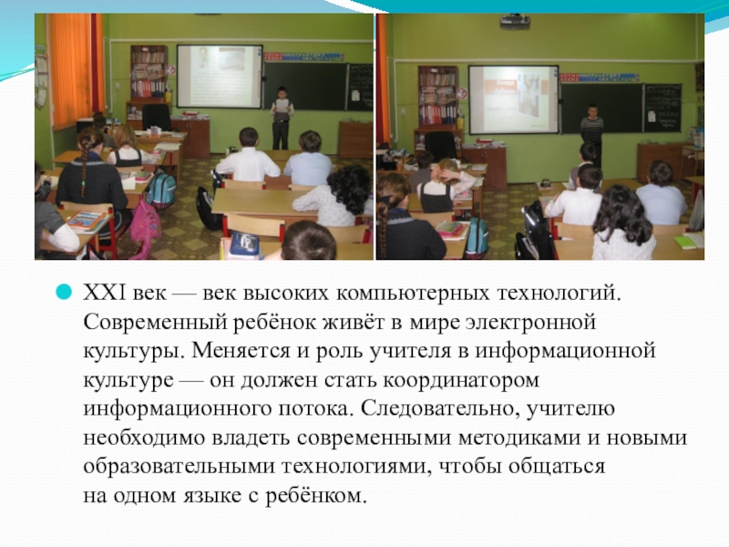 Меняется и роль учителя в информационной культуре — он должен стать координатором информационного потока. Следовательно, учителю необходимо владеть современными методиками и новыми образовательными технологиями, чтобы общаться на одном языке с ребёнком.