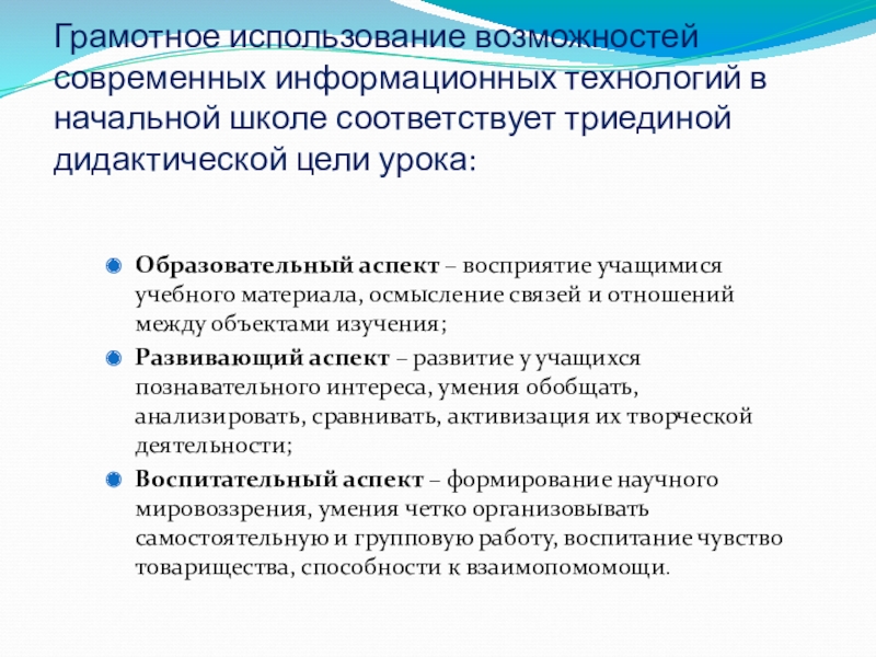 Слайд 26Грамотное использование возможностей современных информационных технологий в начальной школе соответствует триединой