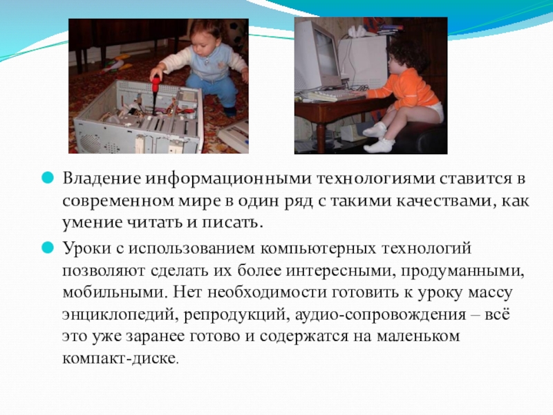 Уроки с использованием компьютерных технологий позволяют сделать их более интересными, продуманными, мобильными. Нет необходимости готовить к уроку массу энциклопедий, репродукций, аудио-сопровождения – всё это уже заранее готово и содержатся на маленьком компакт-диске.
