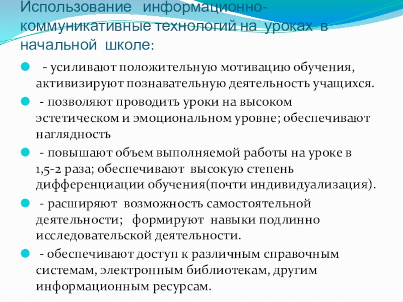 Слайд 4Использование информационно-коммуникативные технологий на уроках в начальной школе: