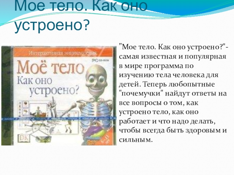и популярная в мире программа по изучению тела человека для детей. Теперь любопытные "почемучки" найдут ответы на все вопросы о том, как устроено тело, как оно работает и что надо делать, чтобы всегда быть здоровым и сильным.