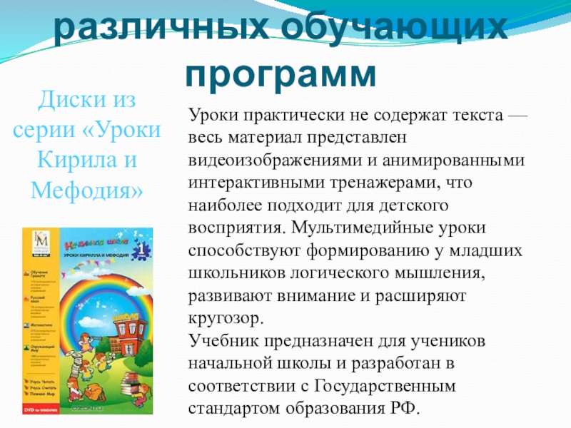 представлен видеоизображениями и анимированными интерактивными тренажерами, что наиболее подходит для детского восприятия. Мультимедийные уроки способствуют формированию у младших школьников логического мышления, развивают внимание и расширяют кругозор.