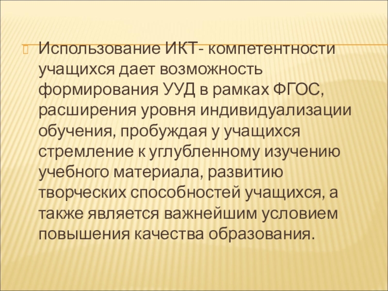 Слайд 40Использование ИКТ- компетентности учащихся дает возможность формирования УУД в рамках ФГОС,
