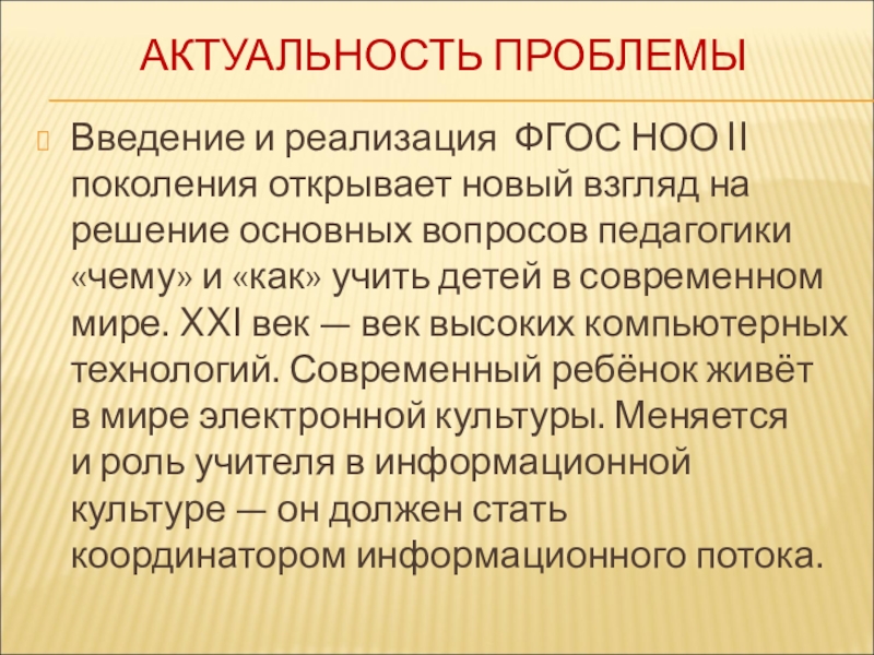 НОО II поколения открывает новый взгляд на решение основных вопросов педагогики «чему» и «как» учить детей в современном мире. XXI век — век высоких компьютерных технологий. Современный ребёнок живёт в мире электронной культуры. Меняется и роль учителя в информационной культуре — он должен стать координатором информационного потока.
