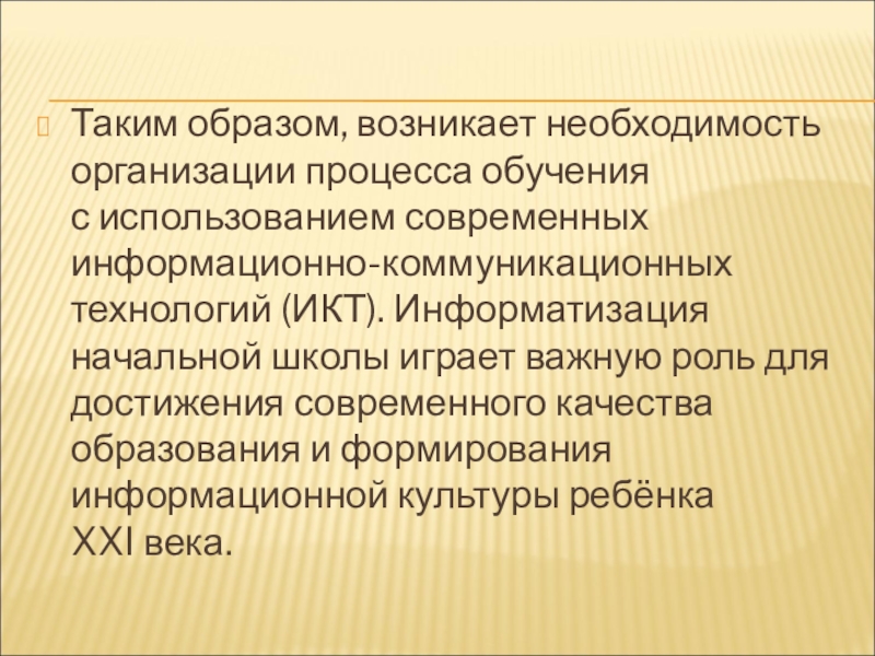 (ИКТ). Информатизация начальной школы играет важную роль для достижения современного качества образования и формирования информационной культуры ребёнка XXI века.